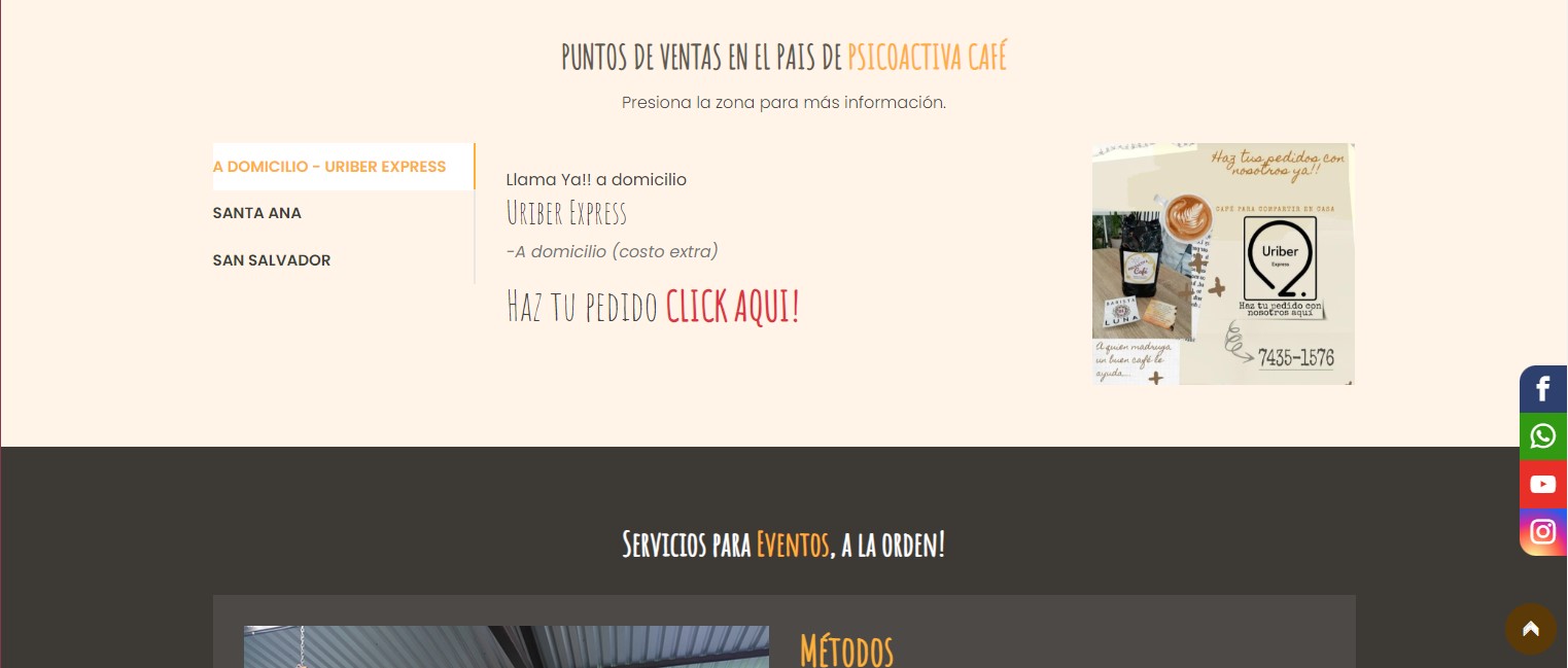 Página web dinámica, creada con javascript, css, html y php, contiene un formulario el cual manda mensajes al correo electronico establecido, asi como se pueden hacer pedidos a Whatsapp del producto Café Psicoactiva, en distintos puntos del país, servicios de barista, etc.